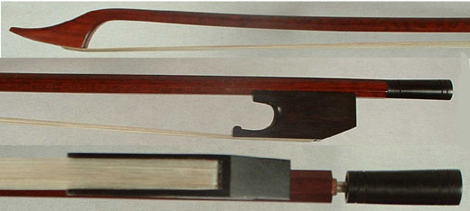 Very high grade bows in the Old French tradition. Dark, round, strong pernambuco wood. Full silver-mounted ebony frog with rounded heel. Parisian eyes. Silver-capped button. | $2000 |