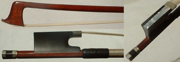 | Rob Reichel, Germany #3/4-405 | Fine old German-style, nickel-silver mounted ebony frog. Made by Robert Reichel, in Markneukirchen c.1900. Dark Round pernambuco wood. 134.5 grams.The #2800 is branded under the frog on the stick. Bass bow. | $1650 |