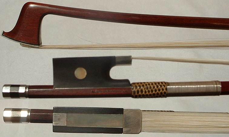 This high quality bow was made by Albert Nurnberger for "R.Weichold a Dresden" whose brands it bears. It is also branded "Imitation de Tourte." It is a very fine octagonal pernambuco bow with fully silver-mounted ebony frog and button. | $5800 |