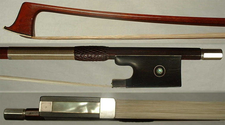 Made of high quality octagonal pernambuco wood. The ebony frog is fully nickel-silver mounted and has a ring around the pearl eyes in the sides. The ebony button has a solid nickel-silver cap. The weight is 59.5 grams. | $3500 |